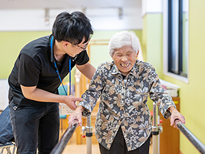 「自分で歩くという行動は、心豊かな生活を過ごすうえで欠かせません。危険のないように注意しながら、楽しくリハビリを行っていただきます」と、森さんもご利用者さまも笑顔。