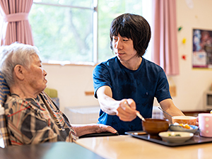 ご利用者さまのお食事にとろみをつけてあげる河本さん。