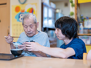 「今日の調子はいかがですか?」と優しくお声がけしながら、ご利用者さまの食べやすいお食事をご用意します。