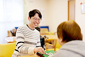 雑談をしながら、ご利用者様とオセロを楽しむ福吉さん。