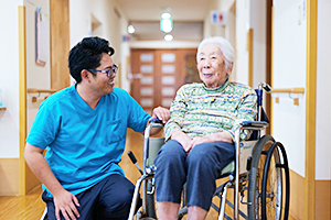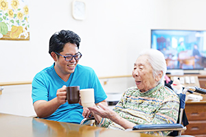 優しい笑顔で周囲を和ませる淺海さんに、リラックスして微笑むご入居者様。