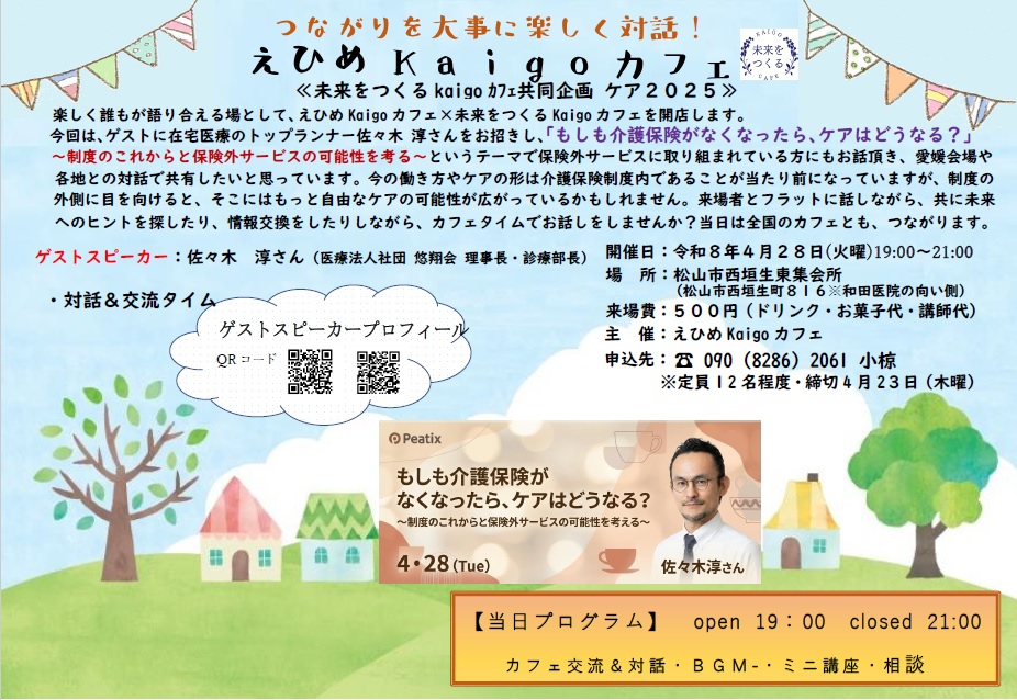 今回は、ゲストに在宅医療のトップランナー佐々木 淳さんをお招きし、「もしも介護保険がなくなったら、ケアはどうなる?」~制度のこれからと保険外サービスの可能性を考る~というテーマで保険外サービスに取り組まれている方にもお話頂き、愛媛会場や各地との対話で共有したいと思っています。今の働き方やケアの形は介護保険制度内であることが当たり前になっていますが、制度の外側に目を向けると、そこにはもっと自由なケアの可能性が広がっているかもしれません。来場者とフラットに話しながら、共に未来へのヒントを探したり、情報交換をしたりしながら、カフェタイムでお話しをしませんか?当日は全国のカフェとも、つながります。