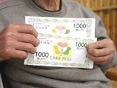 平成16年の設立時から「こうの通貨」という制度を取り入れています。なかなか外出することがなく、「お買い物」の機会が減ってしまった利用者さんに、お金を使うことの楽しさ、選ぶことの楽しさを感じていただきたい。そして、「払う」「稼ぐ」「貯める」ということで、頭のリハビリになれば・・・と考えています。