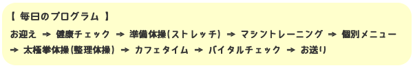 午前か午後のどちらかの時間帯の約3~4時間で、マシントレーニングや体操などで体を動かし、利用者さんの日常生活動作を取り戻すサポートのほか、リフレッシュのお手伝いを行います。入浴や食事はありません。