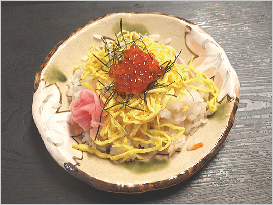 6. お皿に盛り、1.の錦糸玉子、きざみのり、しょうが、イクラをトッピングしてできあがり。