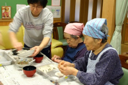 介護スタッフと利用者さんが一緒になって、餃子の皮包みです。