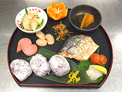 今回のごはんは、焼き塩さば、かぼちゃの煮物、ほうれんそうのおひたし、冷や奴、魚肉バーグ、煮豆、おにぎり。