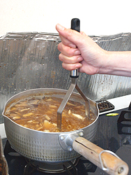 2. 干ししいたけのもどし汁に里芋(厚めの拍子切り)、干ししいたけ、だしの素、しょう油、砂糖、塩少々を入れ、里芋を荒めに潰しながら弱火で15分ほど炊く。