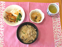 今日の献立は芋々汁、野菜入り魚のすり身揚げ、大根と白ネギの炒め煮。