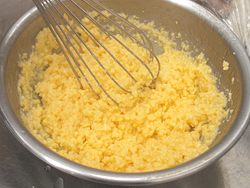 ボウルに入れた卵を何度か温めて→かき混ぜてをくり返すだけで、ダマのないキレイな炒り卵ができます。