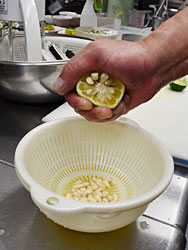 写真は、「焼椎茸と青柚子ご飯」に使う青柚子をしぼっている様子。