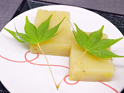 バナナいも羊羹にのせている紅葉は、朝一番にお庭からとってきたものとか。
