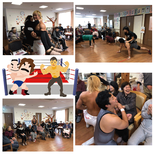 大きく健全な肉体のプロレスラーが、皆様方の地域の大先輩おじいちゃん・おばあちゃんへの『熱い思い』を届けます。