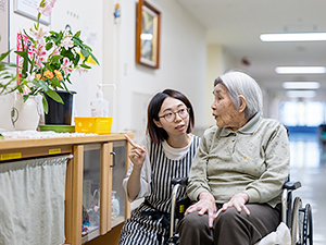 数秒で、先程までの事を忘れてしまう利用者さまもいらっしゃいますが、同じことでも何度でも、ご納得されるまで辛抱強く話し、関わり合います。
