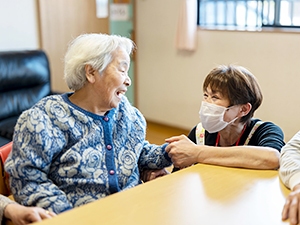 利用者様と談笑する浜本さん。