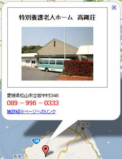 地図の上のマーカー をクリックすると、吹き出しで施設情報が表示されます。 |