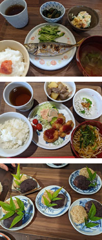 ご近所からいただいた野菜、畑で採れた野菜、釣りたての魚など、その時その時の食材で、季節の料理を作っています。